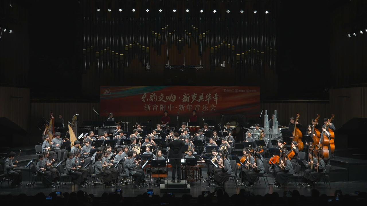 12月28日晚,浙江音乐学院附属音乐学校“乐韵交响,新年共华章”新年音乐会在浙音音乐厅举行。演出由浙江音乐学院附属音乐学校与浙音乐典文化联合主办,汇聚了140名师生参与演出。值得一提的是,浙江音乐学院附属音乐学校交响乐团和国乐团首次同台亮相,这两支乐团均为省内编制最完整、专业水准最高的青少年乐团。演出中,西方交响乐与中国民族管弦乐交相辉映,经典作品与当代原创作品同台演绎,充分展现了附中师生的艺术风采与专业水准。