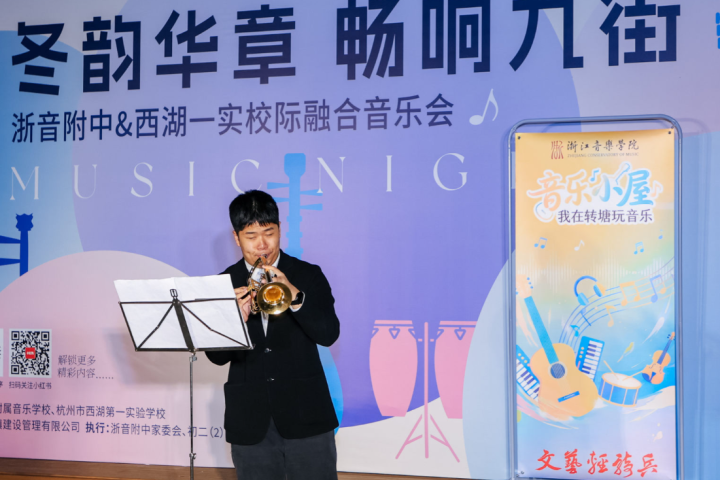 12月22日晚,由浙江音乐学院附属音乐学校与杭州市西湖第一实验学校联合主办的“畅响九街·冬韵华章”校际融合音乐会,在杭州西湖龙坞茶镇九街音乐厅温暖启幕。