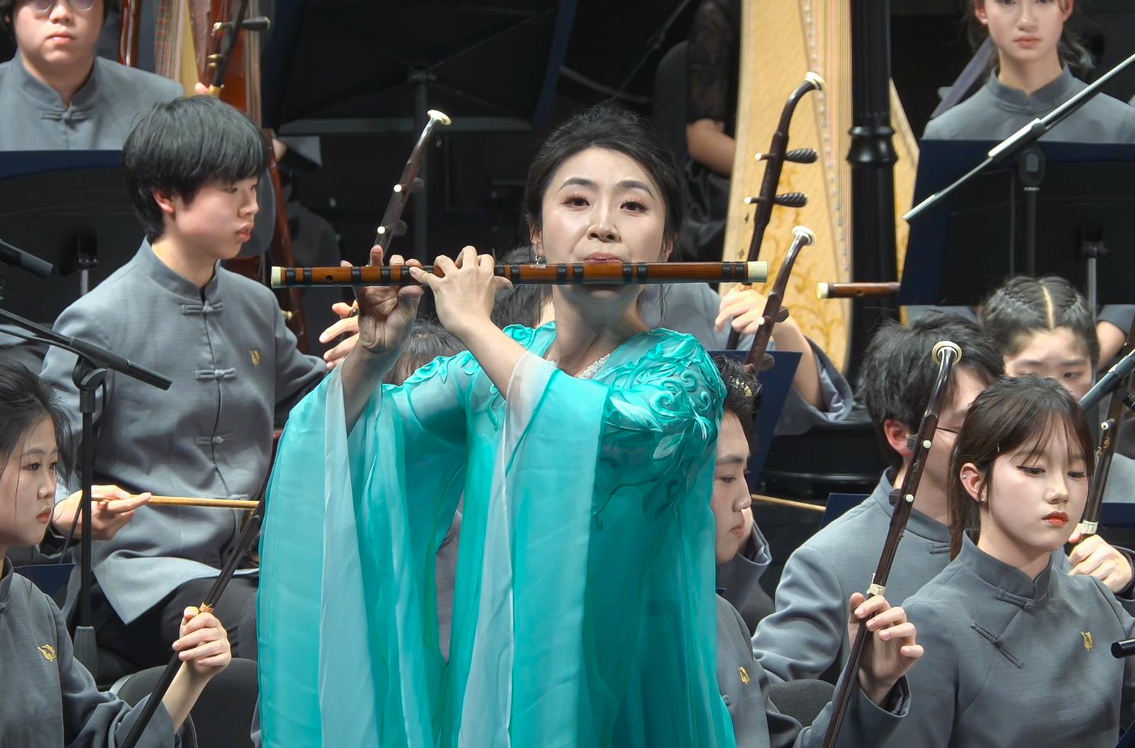 本场音乐会带来了多部作品的全国首演——青年作曲家刘畅创作的扬琴协奏曲《欢歌》由附中青年教师黄煌精湛演绎。作品取材于广西东兰民歌,在传统旋律与现代节奏之间搭建起富有弹性的桥梁。作为首演,演奏中保留着恰到好处的“新鲜感”,而乐队与独奏之间的配合,则显现出长期教学与排练所形成的高度默契。
