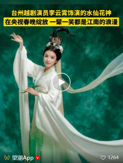 歌咏创意秀《贺花神》梦幻上演,浙江小百花越剧院青年演员李云霄化身十二月的水仙花神,洛神雪白水袖翩跹,翩若惊鸿、婉若游龙。