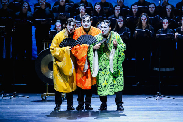 舞台视觉上,舞美设计没有追求所谓的“真实”,而是忠实还原了普契尼时代西方人对东方的浪漫“想象”——舞台布景源自1924年斯卡拉歌剧院的原始手稿,简洁而富有象征意味,借助多媒体等现代技术,在舞台上勾勒出一个由丝绸、瓷器和茉莉花编织的东方梦境。