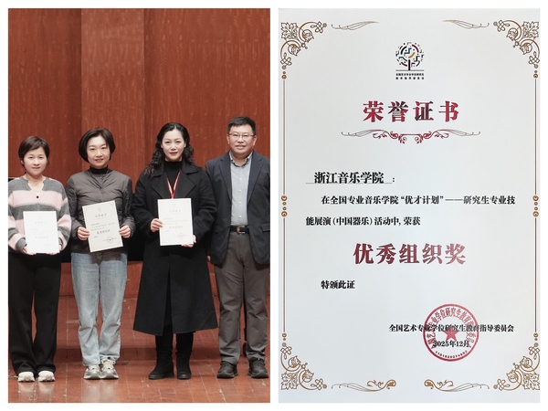 全国专业音乐学院“优才计划 ”(中国器乐)展演则为全国专业音乐院校研究生搭建高水平的艺术实践平台,切实提升学生的专业实践创新能力。学院凭借出色的组织工作获评获评全国艺术专业学位研究生教育指导委员会颁发的“优秀组织奖”,充分彰显了浙音在研究生实践创新能力培养方面的显著成效,以及在艺术硕士教育体系化建设中的积极作为。