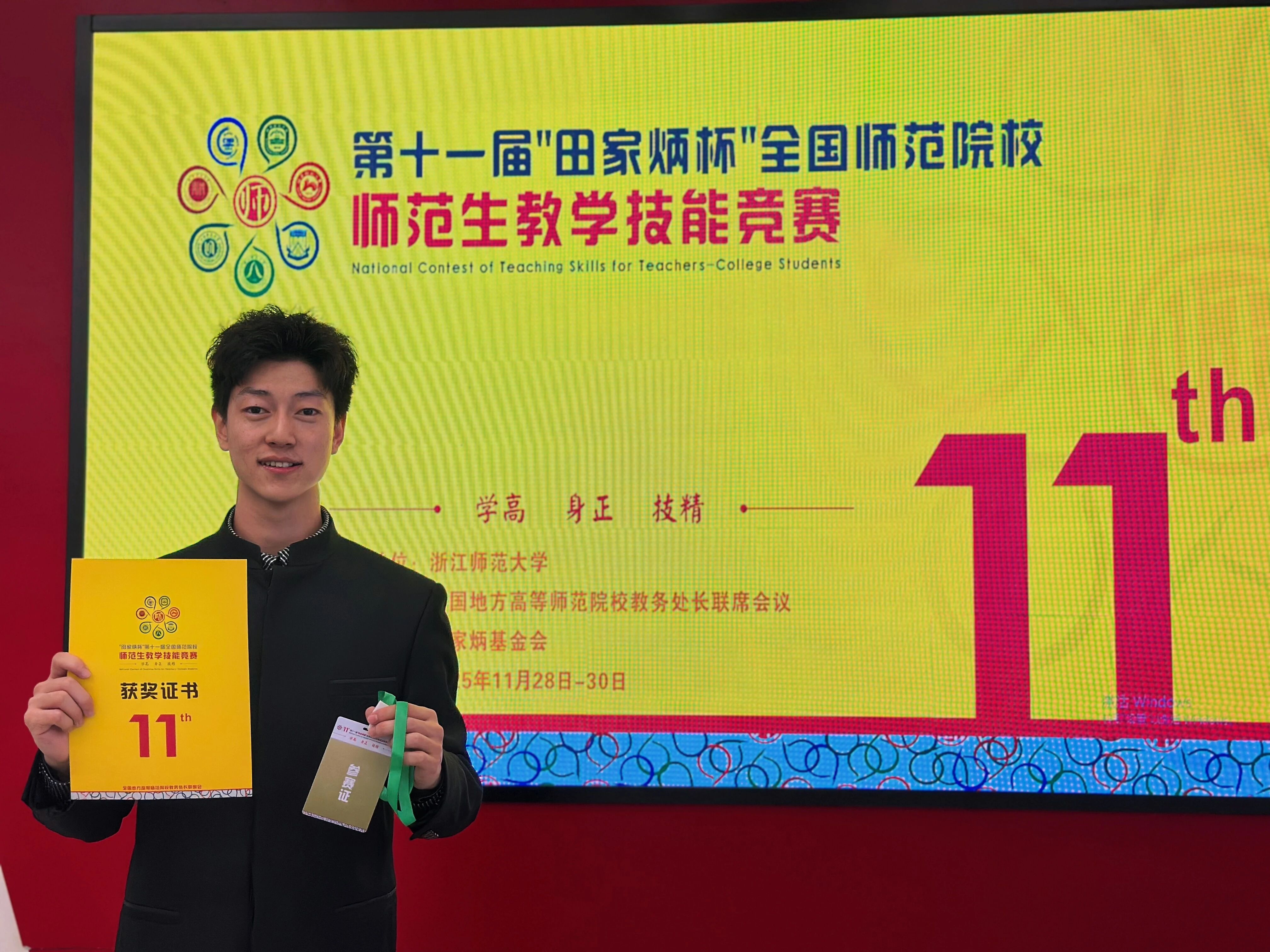 在第十一届“田家炳杯”全国师范院校师范生教学技能竞赛中,音乐教育学院王才浩同学凭借扎实的专业功底、出色的教学设计与稳定的现场发挥,荣获一等奖。“田家炳杯”竞赛是经高等教育质量监测国家数据平台认定的国家级A类赛事,影响力广、权威性高。本届赛事规模宏大,共吸引全国289所师范院校的2345名选手参与初赛。经过严格评审,来自178所学校的564名选手入围决赛。王才浩同学在激烈的决赛角逐中喜获佳绩,体现了学院学子过硬的教学技能与良好的综合素养。