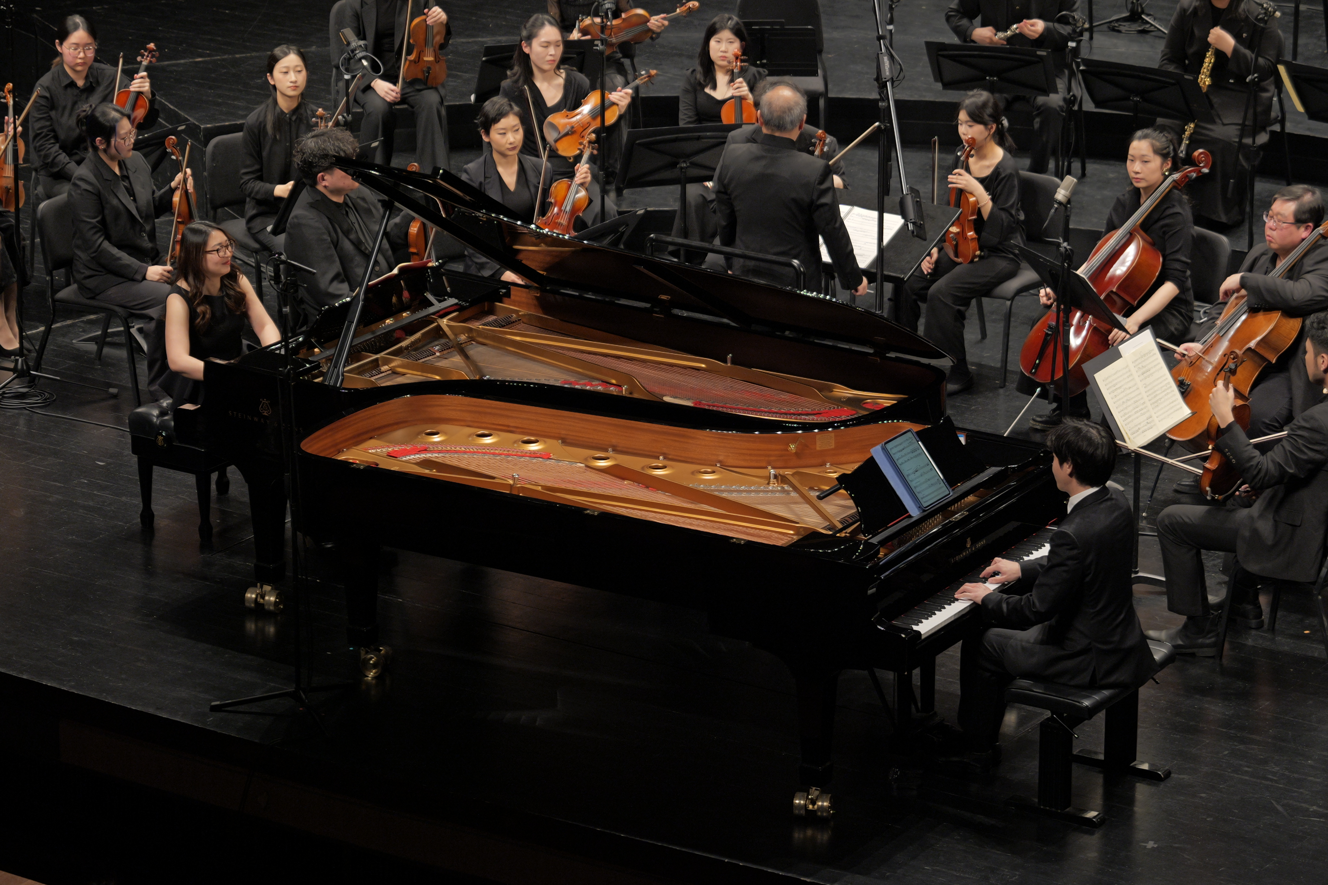 莫扎特《降E大调第10号钢琴协奏曲》的奏响,是琴键与管弦的浪漫和鸣。这部作品是莫扎特为数不多的双钢琴协奏曲,也是古典双钢作品中的瑰宝,由贾然担任第一钢琴,孙榆桐担任第二钢琴。两位钢琴家指尖轻舞,在黑白琴键间翩然跃动,演奏的旋律彼此交织相融,时而婉转呼应,时而铿锵共鸣,以音符为语、以旋律为言,尽显琴键间默契对话的极致美感,余韵绵长。管弦旋律如轻纱般包裹着钢琴的音色,既不喧宾夺主,又能精准烘托出音乐的层次与氛围,让现场听众陶醉于浪漫与美妙氛围之中。