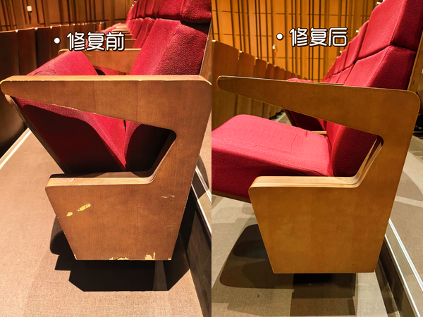 场馆设施完好度是观演品质的重要基础。在常态化巡检中,工作人员发现部分座椅木饰面因长期使用、环境温湿度变化等因素,出现老化、破损、色泽不均等情况,既影响场馆整体美观,也降低了观众就座舒适度。对此,浙音演艺快速响应、立即部署,启动专项修缮工作,明确修缮标准、细化施工流程、严控工期节点,高效推进全流程工作,历时一个月顺利完成全部修缮任务。