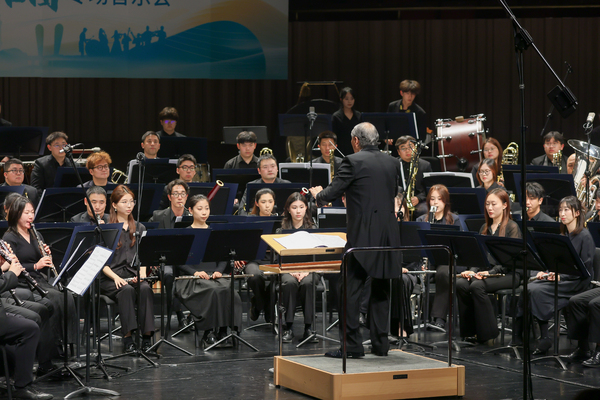 演出曲目横跨东西,既有《三首庆典号角》的华丽开场,也有《库洛莱娜的姑娘》的异域风情。青年演奏家康凯的单簧管独奏《黑狗》狂想曲惊艳全场,将古典与摇滚完美融合;《黄石肖像》选段则描绘出壮丽的自然画卷。最后,《在希望的田野上》以管乐新编唤起集体记忆,温暖人心。