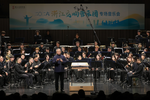4月15日晚,学院音乐厅内座无虚席。由浙江省教育厅主办,浙江音乐学院(浙江省大学生艺术团总团)、浙江音乐学院继续教育学院、浙江音乐学院资产经营公司、浙江省音乐家协会管乐学会、浙江交响乐团、杭州爱乐乐团 、浙江音乐学院管弦系、浙江省社会音乐教育协会承办的“2026浙江交响管乐团专场音乐会”在此奏响。
