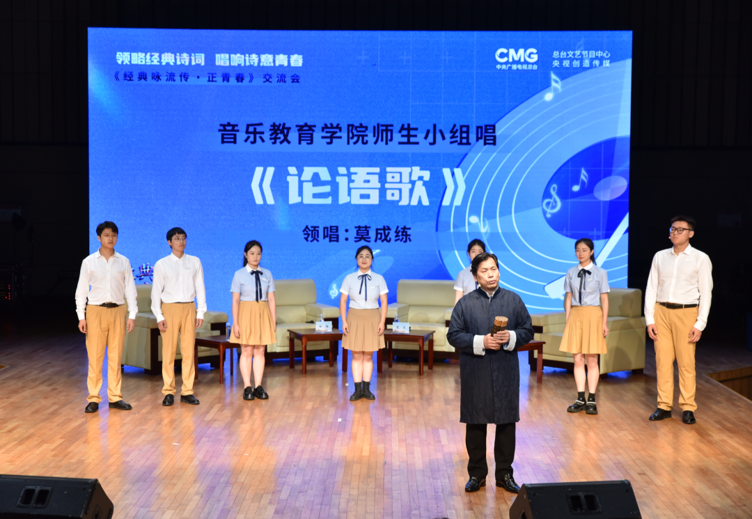 现场师生还共同观看了《经典咏流传·正青春》的节目宣传片和节目视频,与主创团队相互交流,音乐教育学院硕士生导师莫成练及学生们演唱了本校诗词改编歌曲《论语歌》,受到了主创团队的高度赞扬。