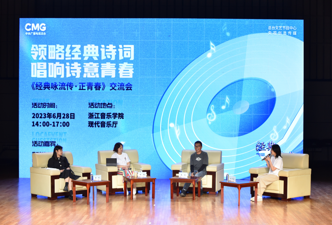 “和诗以歌唤醒经典,把青春唱给你听”。6月28日下午,央视《经典咏流传·正青春》节目制作人田梅及主创团队走进浙音校园与学生交流互动。学院副院长汪洋出席活动,“经典传唱人”、流行音乐系教授、音乐唱作人庞龙,流行音乐系研究生万羽翼,以及师生代表参加。
