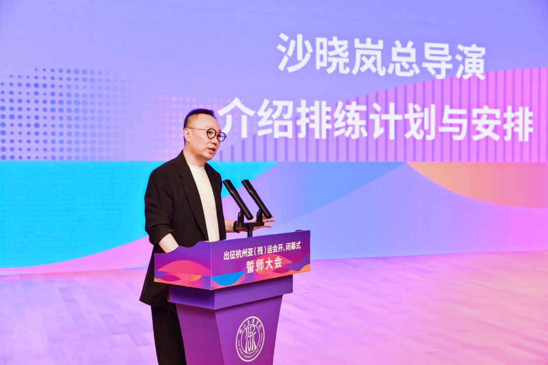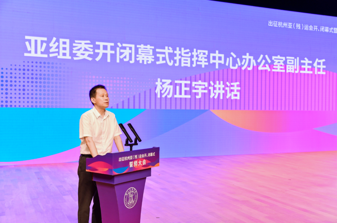 杨正宇对浙音师生服务保障杭州亚(残)运会的全力支持表示衷心感谢!他表示,杭州亚(残)运会是国之大事、省之要事,开闭幕式表演是杭州亚(残)运会能否成功举办的关键环节、高光时刻。他表示,参与杭州亚(残)运会是为国争光、无上光荣,希望大家心怀“国之大者”,在长时间的准备排练中,时刻牢记艰苦奋斗,将这一段珍贵难忘的经历变为人生的宝贵财富。最后,他叮嘱同学们严守工作纪律,拿出最好状态、练出最好质量、呈现最佳效果,助力杭州亚(残)运会办成只留经典不留遗憾的精彩盛会。