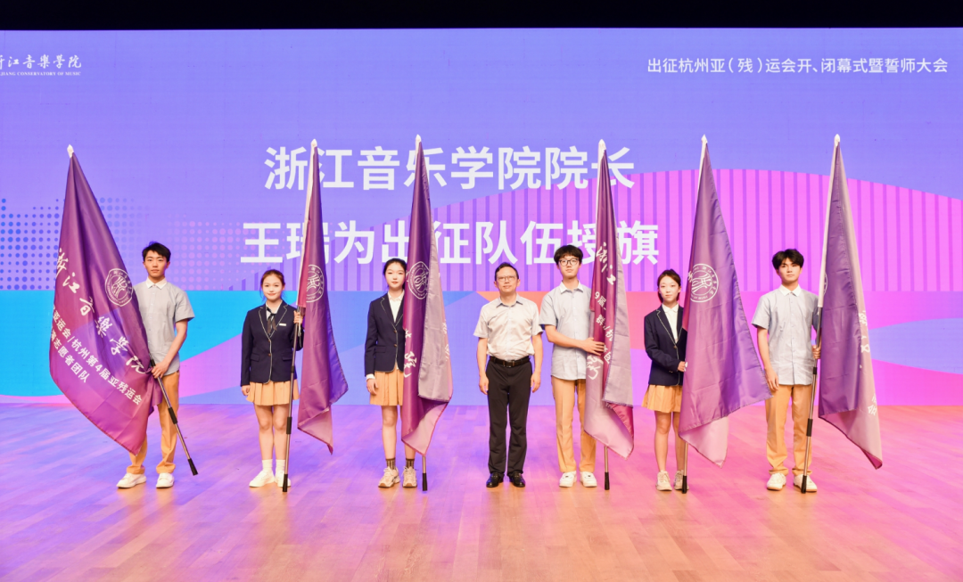 6月30日下午,伴随着音乐教育学院行进管乐队雄壮嘹亮的进行曲,浙江音乐学院出征杭州亚(残)运会开闭幕式誓师大会在综艺楼黑匣子剧场隆重举行。