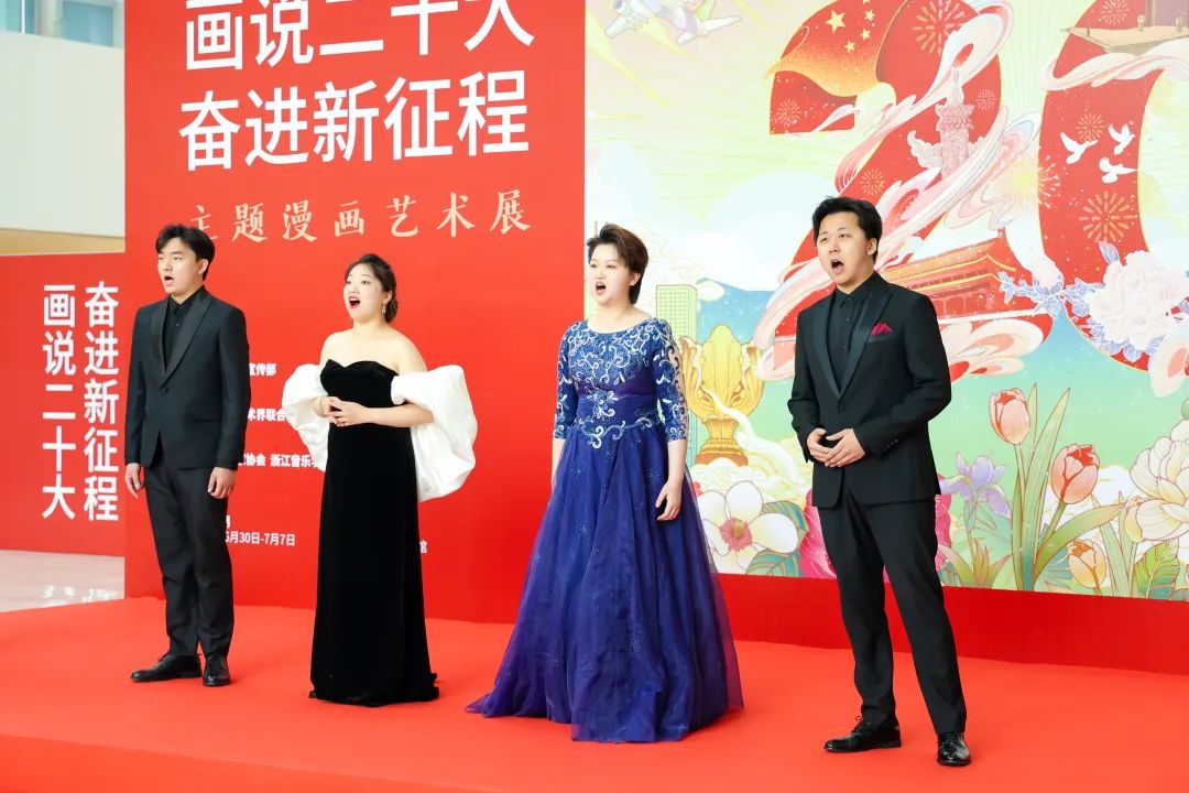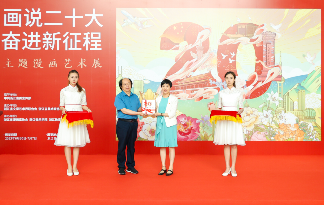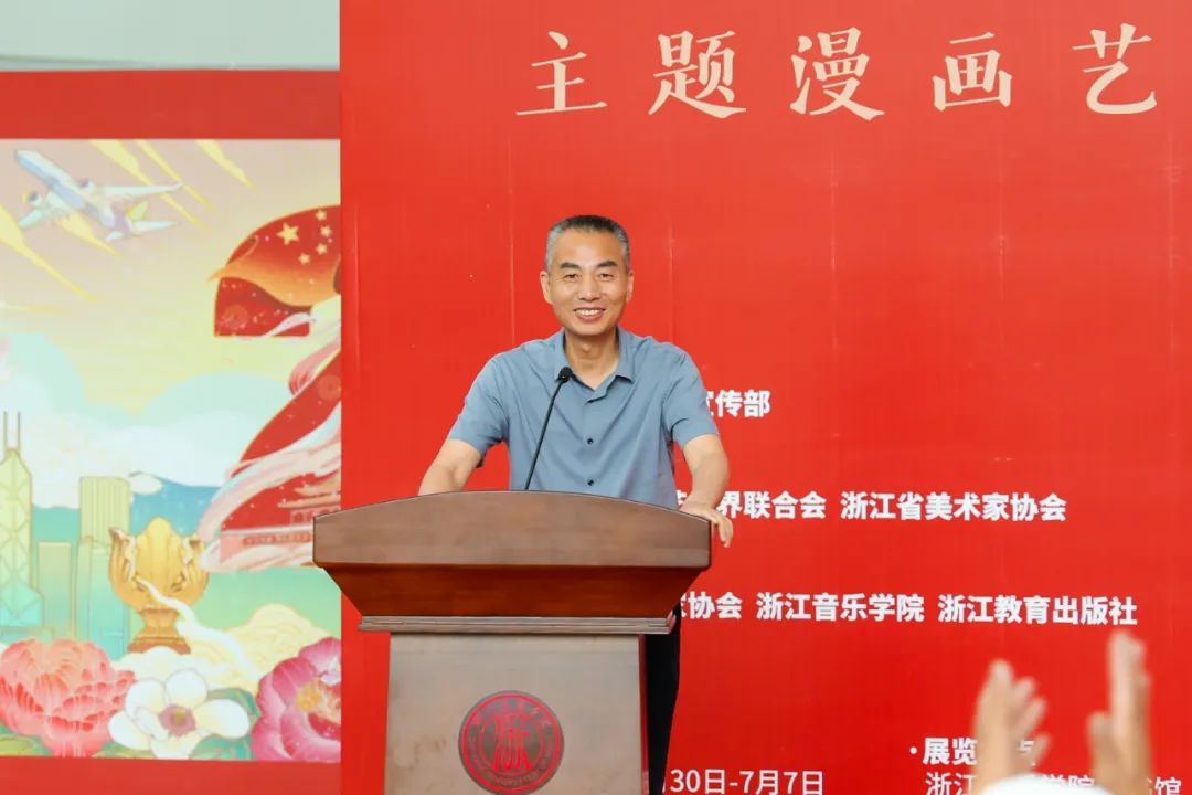 陶小明表示,在深入开展学习贯彻习近平新时代中国特色社会主义思想主题教育之际,主题漫画艺术展从浙江展览馆出发,深入乡村、企业、学校,来到了全省唯一的音乐艺术本科高校具有重要意义。此次艺术展中,漫画发挥文艺轻骑兵作用,通过喜闻乐见的绘画形式,将党的二十大精神呈现出色彩鲜艳、内容丰富、艺术感染力强的画面感。与此同时,音乐是有声的绘画,绘画是无声的音乐,二者碰撞在一起,共同奏响了主题漫画欢快动人的乐章,讴歌了伟大的新时代和奋进新征程的雄壮节奏。他相信,在与社会各界的真诚合作中,艺术的道路会越走越宽广。