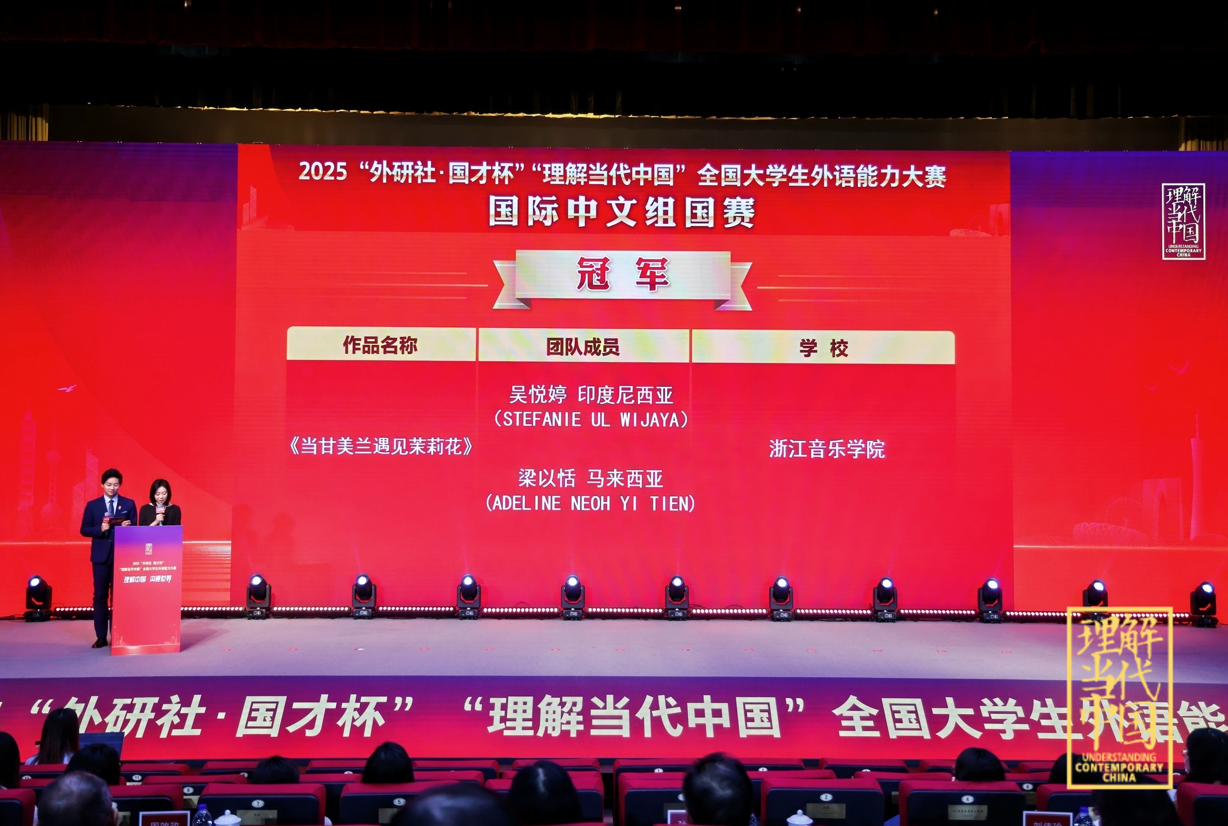 12月8日,由北京外国语大学主办、外语教学与研究出版社承办的2025全国大学生外语能力大赛国际中文组短视频赛项全国总决赛在北京圆满落幕。流行音乐系印度尼西亚籍学生STEFANIE UL WIJAYA(吴悦婷)与音乐工程系马来西亚籍学生ADELINE NEOH YI TIEN(梁以恬)共同创作的短视频《当甘美兰遇见茉莉花》荣获金奖(冠军),实现学院在该项赛事中新的突破。