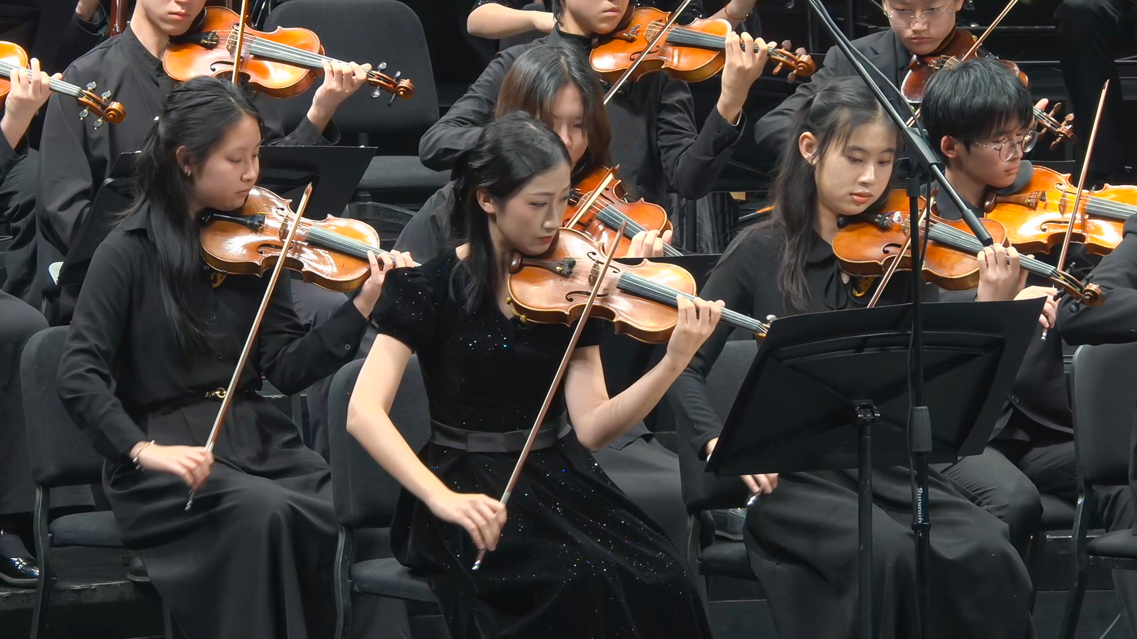 音乐会最终在著名作曲家刘文金改编的民族管弦乐《我的祖国》中抵达情感高点。熟悉的旋律从弹拨乐的轻柔展开,逐步汇入全乐团的磅礴齐奏。那一刻,音乐厅中流淌出的宏大宣示,更像是一种真切而自信的热爱——属于这一代少年,也属于他们所处的时代。