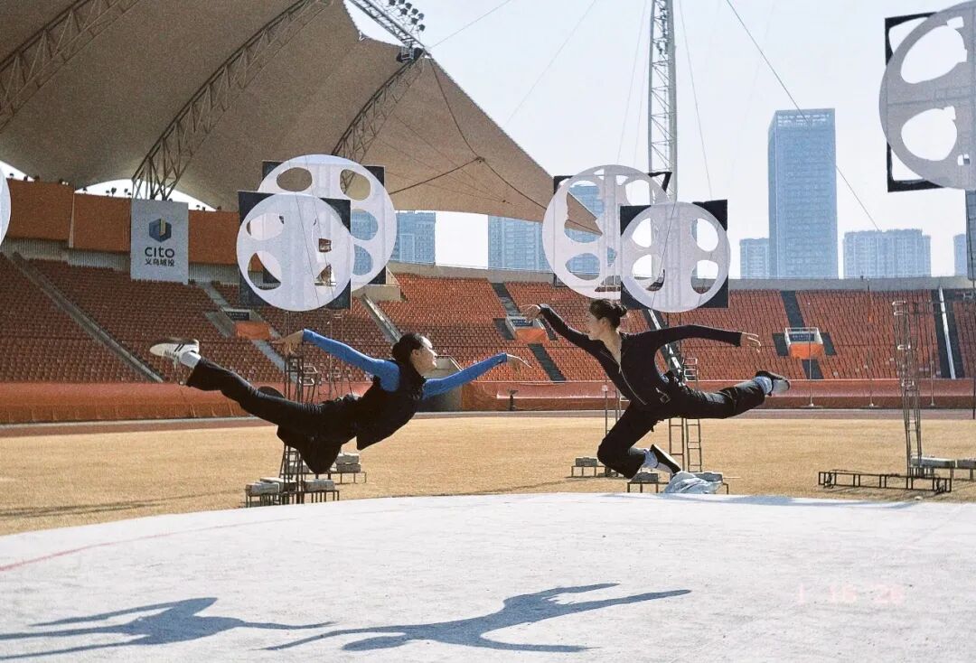 第一篇章“鸡毛换糖”,十米高空,两个身影御风而行。作为演出参与者,舞蹈学院两名17岁的大一女孩何涵、李鑫宇悬于威亚之上,旋转、起舞,在空中完成高难度双人舞蹈。她们以凌空之姿,艺术化再现“鸡毛换糖”的历史传承,描摹义乌精神乘风腾飞的新图景。然而,这份轻盈的背后,是难以想象的磨砺。虽然从小学舞,但吊威亚对两个女孩而言无疑是全新挑战。作为“鼓槌”的两端,她们只有动作绝对一致,才能在空中保持平衡。排练期间,她们每天都要练习,最长的一天,在空中足足挂了八个小时。从恐高到御风,从磕破下巴到凌空绽放,两名17岁的女孩用一模一样的伤疤和默契,在除夕之夜,化身义乌江畔的“精灵”,敲响了属于奋斗者的春天。