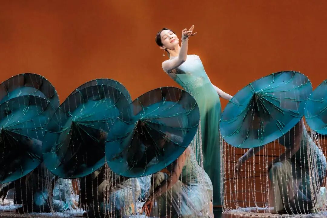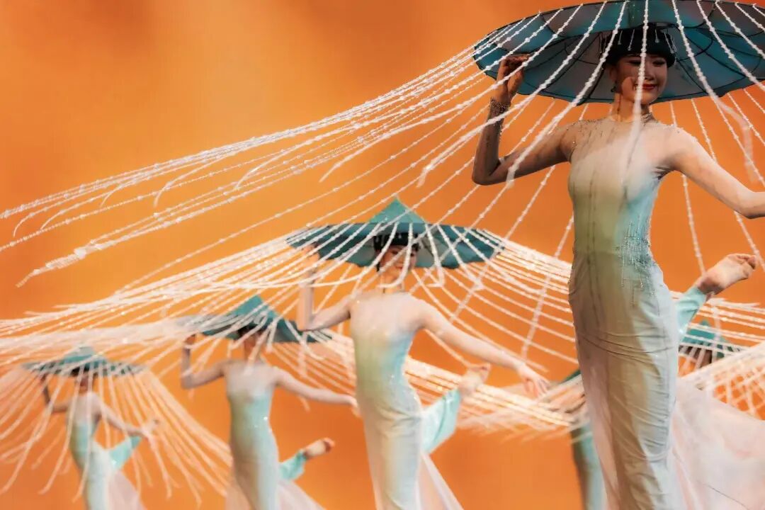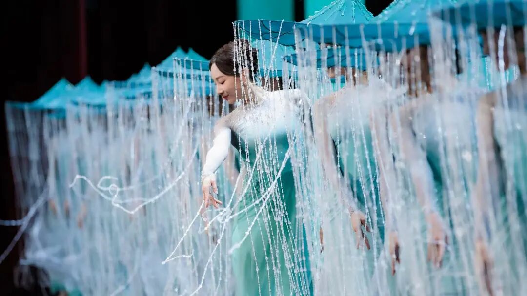 该作品以杜甫诗意为魂,以“雨”与“船”为眼,垂帘斗笠摇曳出斜风细雨,步履如墨勾勒出青山远黛。舞者以小而细碎的动作,展现出诗词中对雨不同形态的描述,如“廉纤”“跳珠”“银索”“斜风细雨”等,在动静相宜间完成对江南品格的美学定帧。舞者们不断变换队形,展现如“轻舟”“屋檐”“远山”等中国古典意蕴的诗意构图,让这场跨越千年的春雨在当代舞台上“润物无声”。