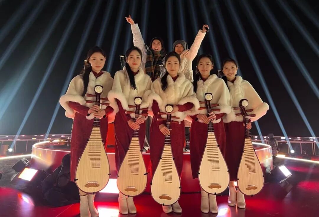 义乌的深冬,薄雾凛风。在义乌之巅城市观景台的“蛋糕形”舞台上,浙音民族室内乐团演奏员黄琳、谭紫玲及国乐系研究生冯叶、王理、程寒千组成的五人琵琶小组,与管弦系学生林宏俊等小提琴演奏员、舞蹈演员共同完成开场演奏。“虽然琵琶部分仅占30秒,镜头可能一闪而过,但能登上国家级舞台,我们感到无比自豪。”演奏员们说道。短短30秒,是在寒风中无数次冻僵又搓热的指尖换来的绽放,是镜头之外无数汗水凝结成的瞬间——这便是浙音人对“台上一分钟”最真实的注解。