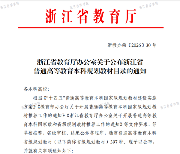 近日,浙江省教育厅发布《关于公布浙江省普通高等教育本科规划教材目录的通知》(浙教办函〔2026〕30号),我校国乐系《中华筝教程》、戏剧系《中国戏曲锣鼓经概述》2部自编教材成功入选,为我校优质教材建设再添成果。